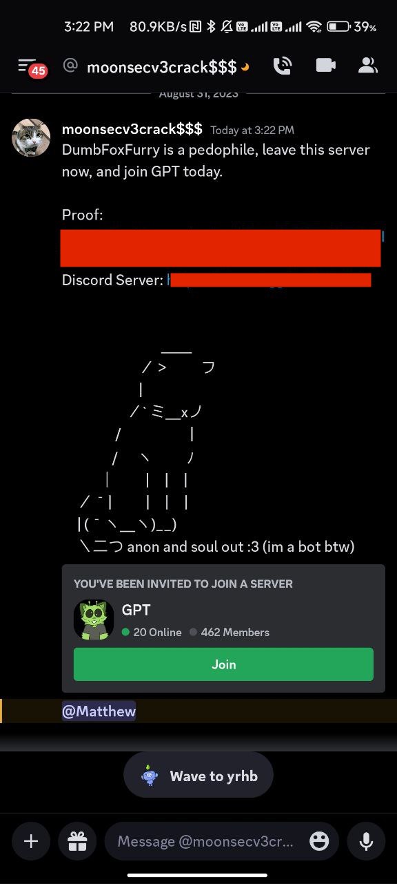 On the 01-September-2023 bwnc joined my discord server under an alt account and Direct messaged a bunch of members telling them I was a pedophile and attached the shitty doxbin link, I have made a YouTube video discussing the incident which I will link below